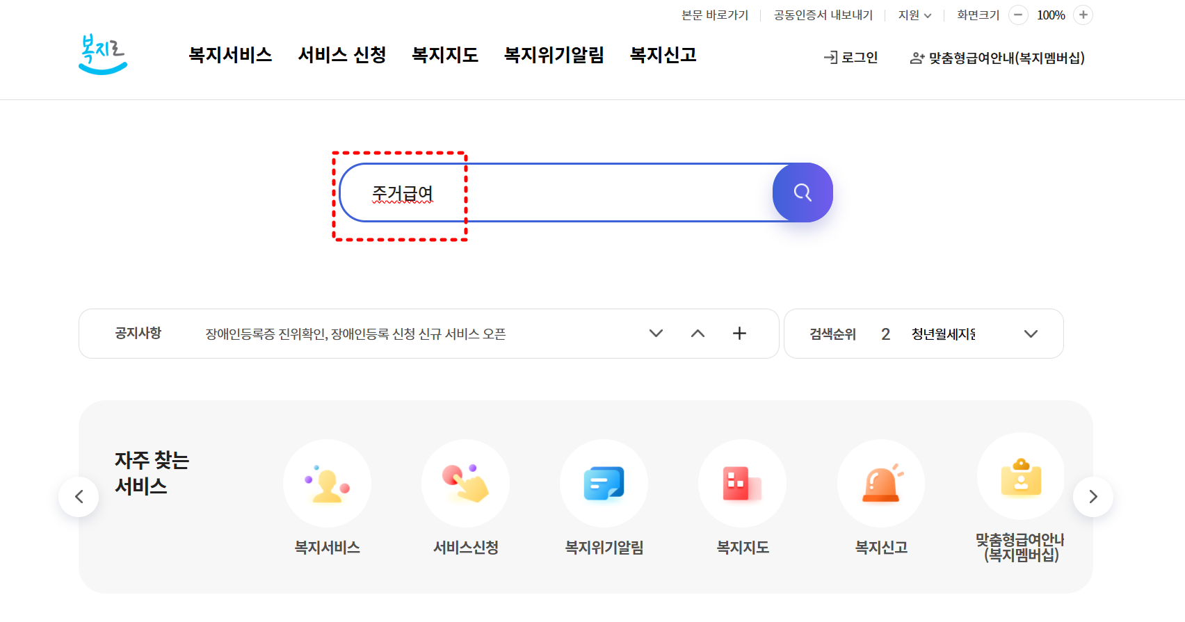 복지로 홈페이지(https://www.bokjiro.go.kr)에 접속.