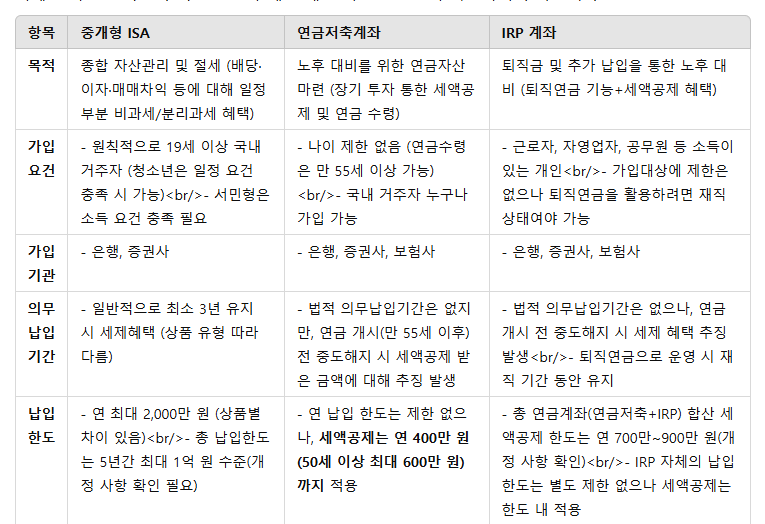 주로 연금저축세액공제를 통해 절세 혜택을 제공하며, 장기적으로 안정적인 노후 자산 마련에 적합합니다.