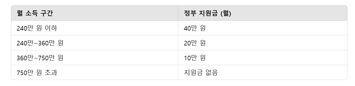 정부에서 개인 소득에 따라 월 최대 4만 원~40만 원의 기여금을 지원합니다.