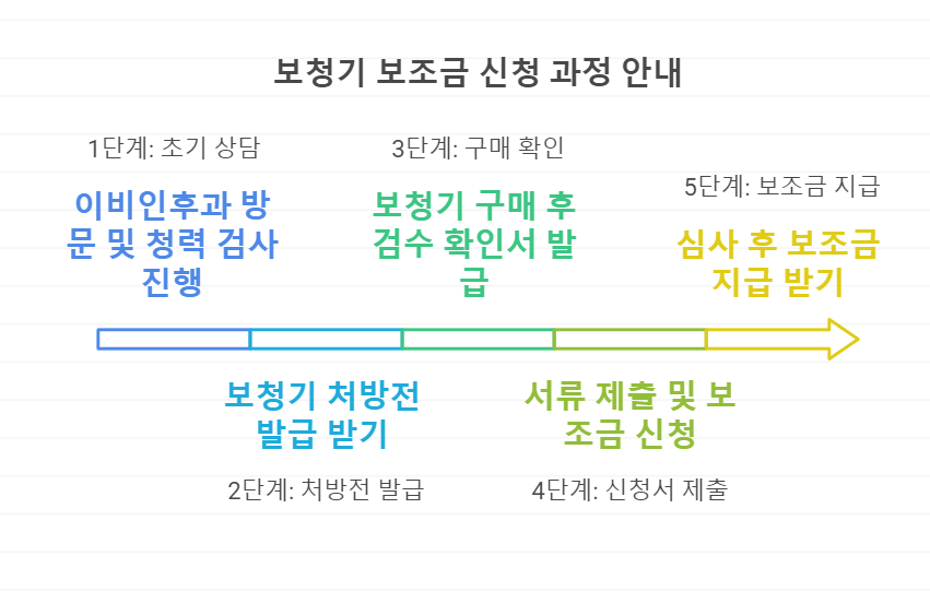보조금을 신청하려면 먼저 이비인후과에서 청력 검사를 받고, 보청기 처방전을 발급받아야 합니다. 이후 아래 절차를 따라 신청할 수 있습니다.