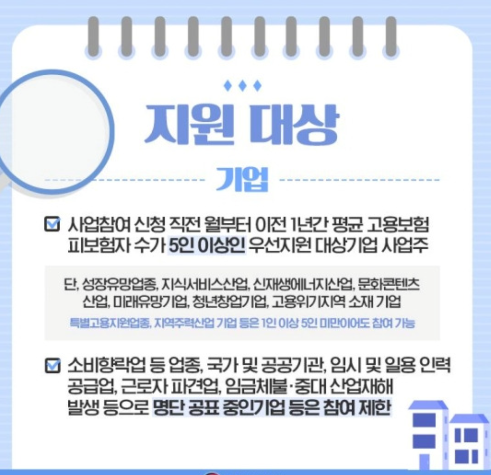 기업: 우선지원대상기업으로, 원칙적으로 5인 이상이어야 합니다. 다만, 지식서비스, 문화콘텐츠, 신재생에너지 산업 등 특정 산업 분야는 1인 이상 기업도 참여 가능합니다. 또한, 사업 참여 신청 직전 월부터 이전 1년간 평균 고용보험 피보험자 수가 5인 이상이어야 합니다.