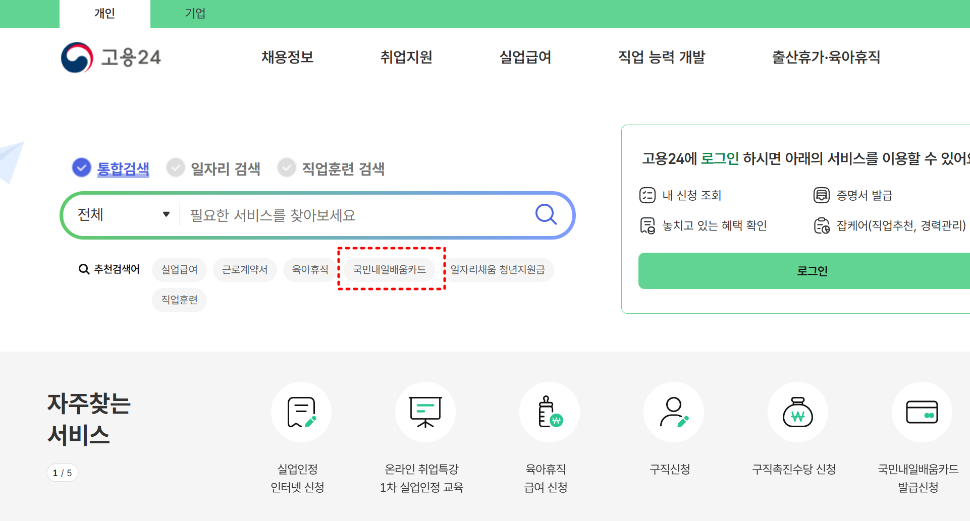 홈페이지 상단 메뉴에서 ‘국민내일배움카드’ 또는 ‘직업훈련’ 메뉴를 선택하고, 그 아래 **‘국민내일배움카드 과정’**을 클릭합니다. 이 메뉴를 통해 국민내일배움카드로 수강 가능한 모든 과정 목록에 접근할 수 있습니다.